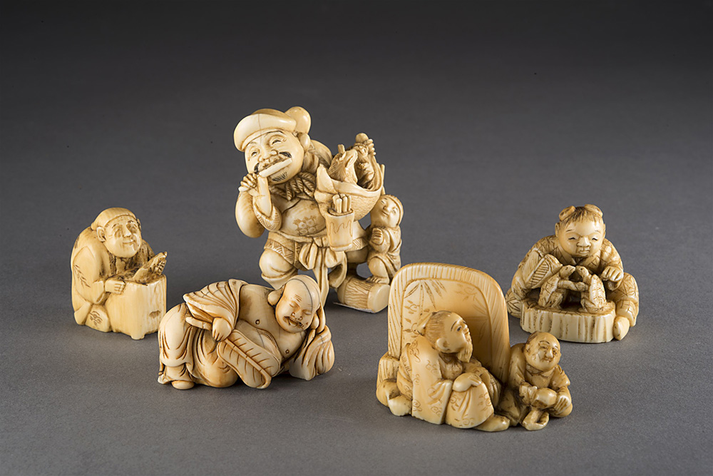Lotto du cinque netsuke, fermagli da cintura, composto da un bambino che gioca con due tartarughe; un uomo accovacciato su un contenitore; un anziano e un bambino vicini ad un paravento; Hotei sdraiato sul suo sacco; Daikoku con un bambino e due topolini (difetti)
