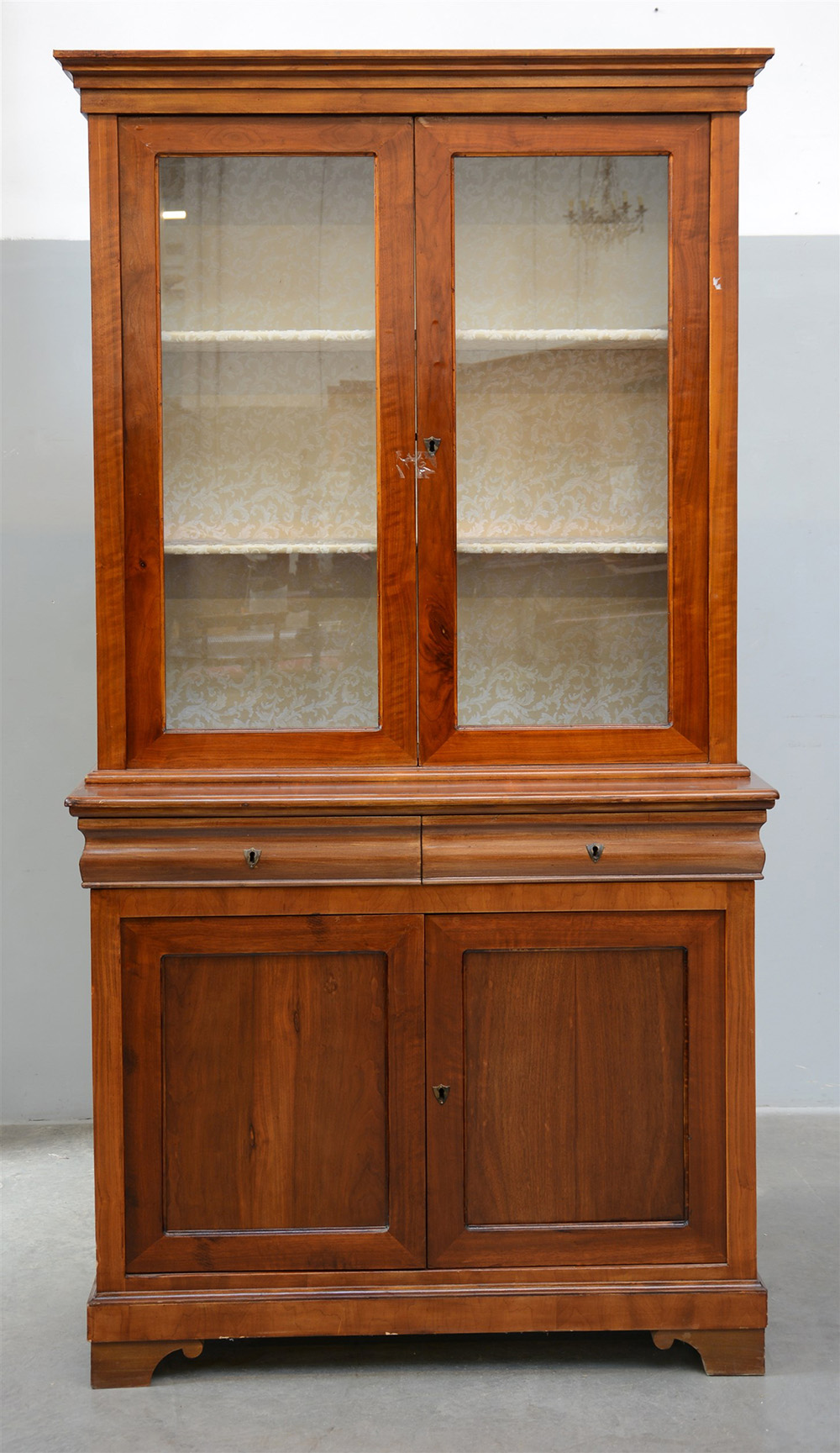 Mobile a due corpi con parte inferiore a due cassetti e due battenti, parte superiore a due sportelli con vetri (cm 120x225x52) (difetti)