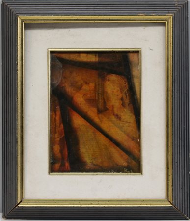 Firma indecifrata, "Composizione con figura" tecnica mista su tela incollata su tavola ( cm 24x18,5) firmata in basso a destra; dedicata, firmata e datata al verso (difetti)