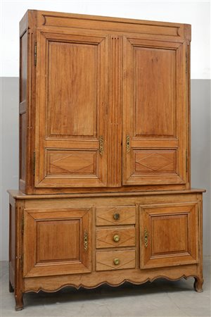 Mobile dispensa a due corpi in legno dolce, parte inferiore a tre cassetti e due sportelli, parte superiore a due battenti. Inizio secolo XX (cm 167x236x56) (difetti)