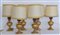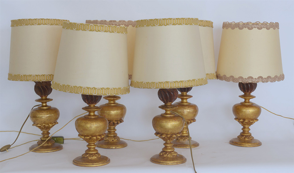 Sei lampade in stile, in legno dorato e intagliato, con paralume in stoffa (difetti)
