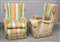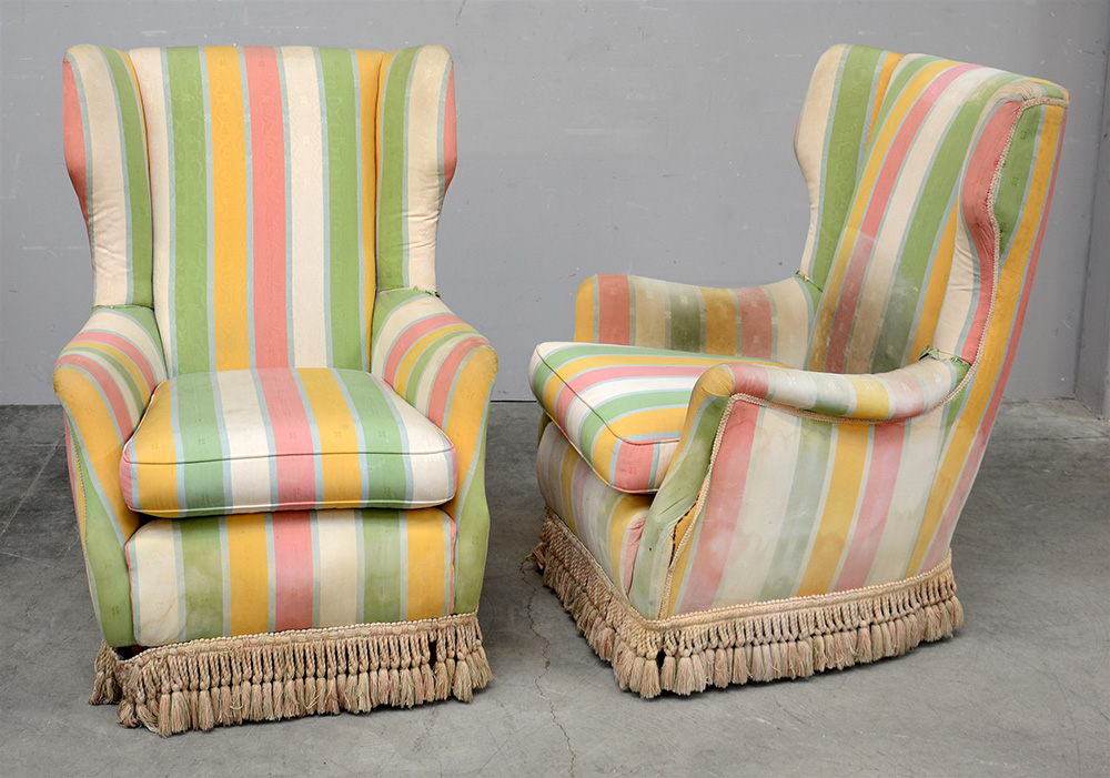 Coppia di bergeres rivestite con tessuto a righe e passamaneria a frange (difetti)