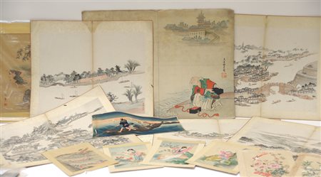 Gruppo di ventuno stampe giapponesi con vari soggetti e decori (difetti)
