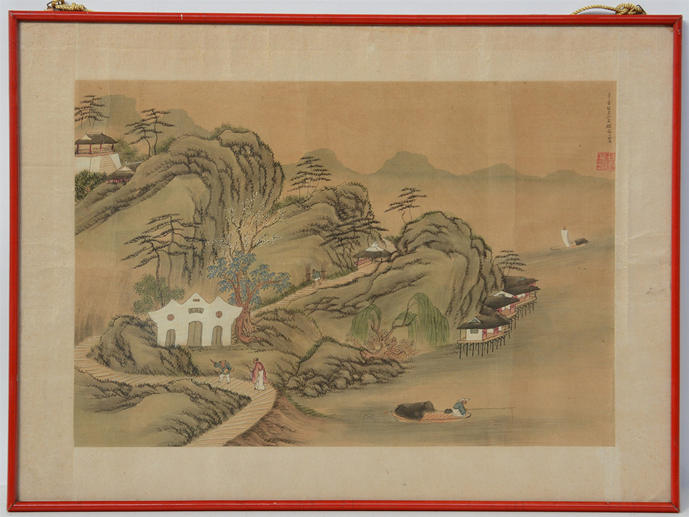Dipinto a inchiostro e colore su seta raffigurante paesaggio, con cornice