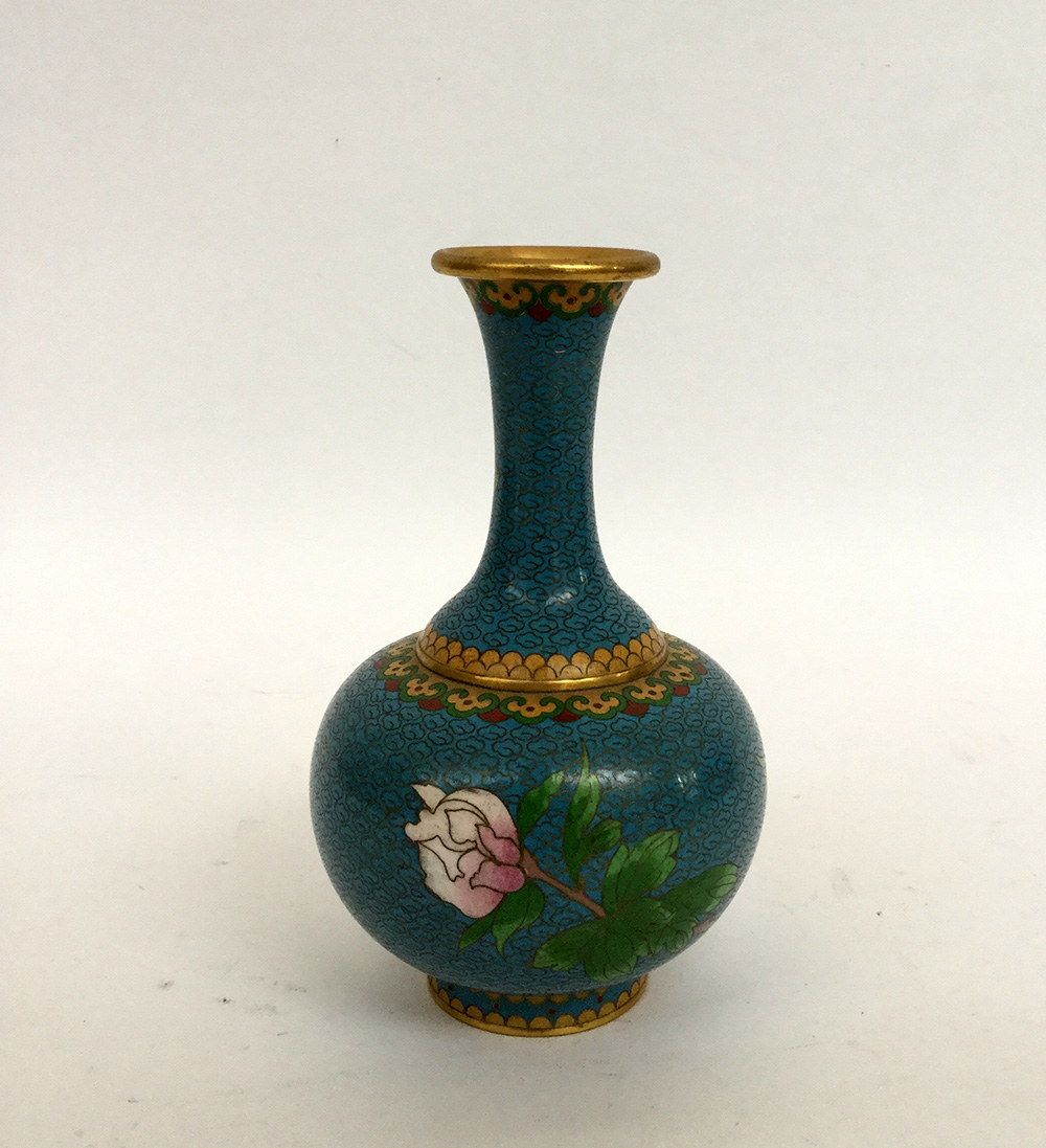 Vaso in metallo cloisonné con decoro floreale su fondo turchese