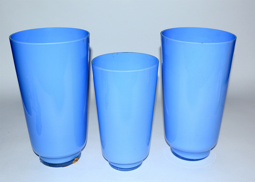 Lotto composto da tre vasi a forma cilindrica in vetro opacizzato color celeste, misure diverse (lievi difetti)