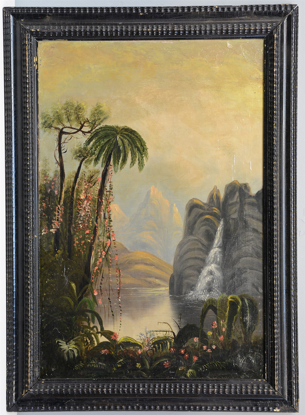 Ignoto "Paesaggio lacustre fantastico" olio su tela (cm 61x41) in cornice (difetti e restauri)