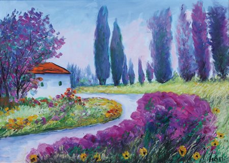 ANTONIO IALENTI Campobasso 12/07/1937 - Campagna toscana, olio su tela cm. 50x70, firma in basso a destra, titolo e firma al retro, dichiarazione d'autenticità dell'artista e archivio della Meeting Art (VC) su foto.