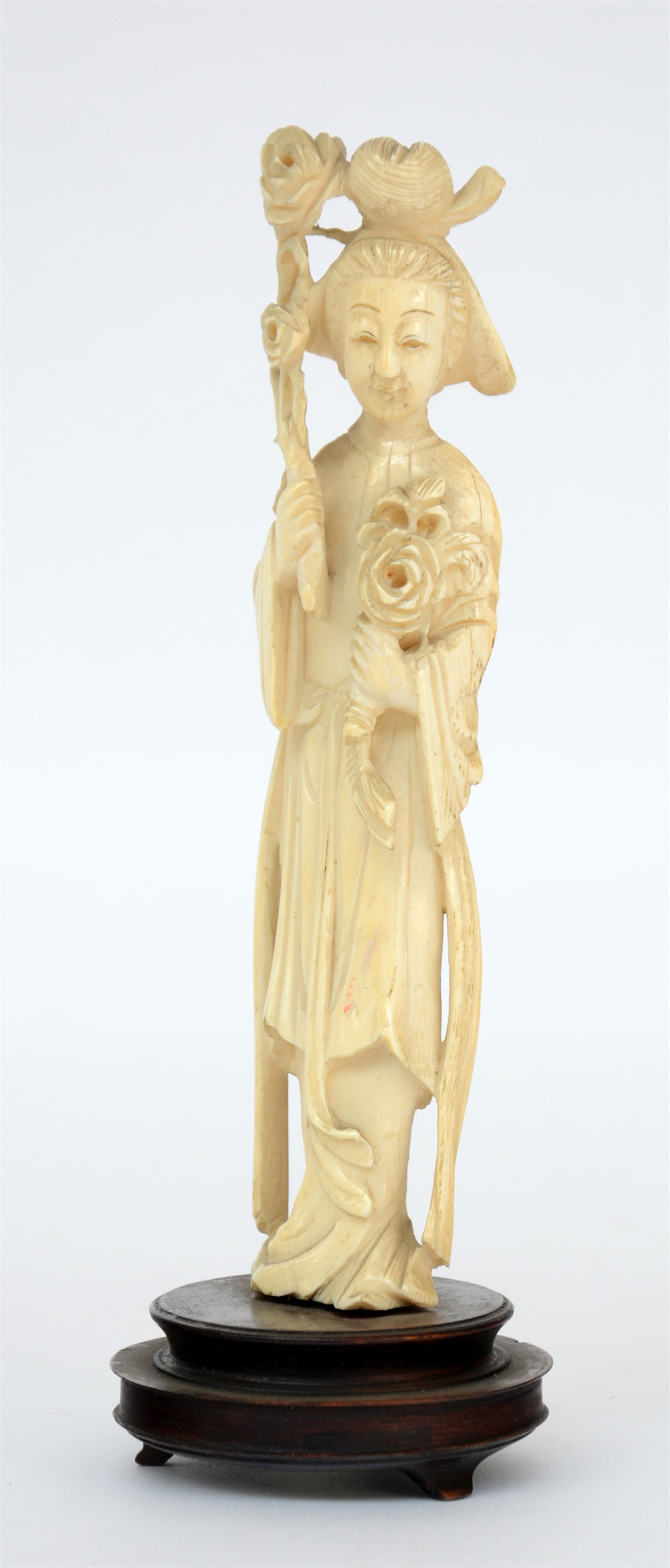 Figura femminile in avorio con ramo di peonie base in legno (h. 20...
