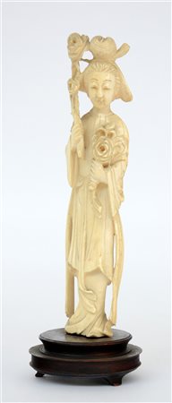 Figura femminile in avorio con ramo di peonie base in legno (h. 20 cm.)(difetti) Cina, sec. XX