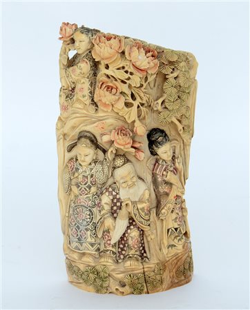 Gruppo scultoreo in avorio raffigurante immortale taoista con servitrici sotto alberi di pino, firmato, dettagli a colori (h. 28 cm.) (difetti) Cina, sec. XX
