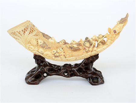 Zanna intagliata con fanciulli e pescatori base in legno (l. 27 cm.)(difetti) Cina, sec. XX