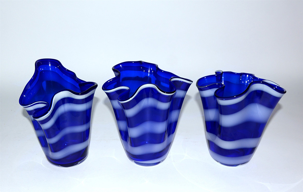 Lotto composto da tre vasi a fazzoletto in vetro blu decorato a striature (h...
