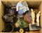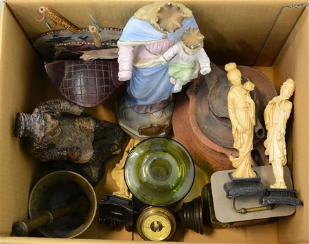Cartone contenente numerosi oggetti di materiali, forme e decori diversi (difetti)