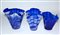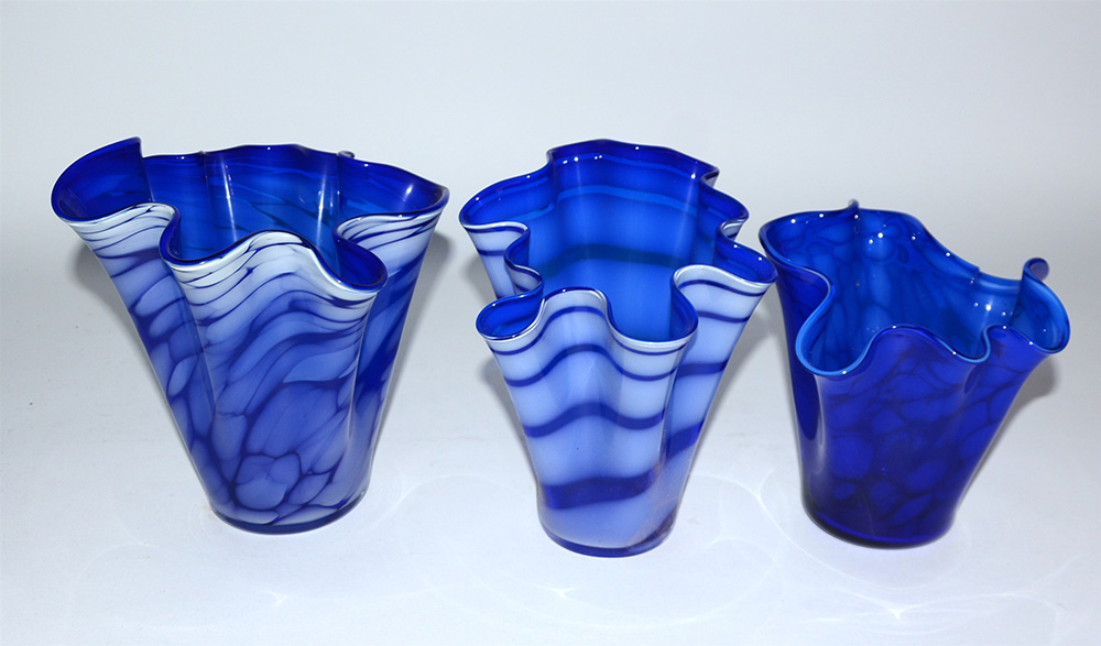 Lotto composto da tre vasi a fazzoletto in vetro blu decorato a striature (h...