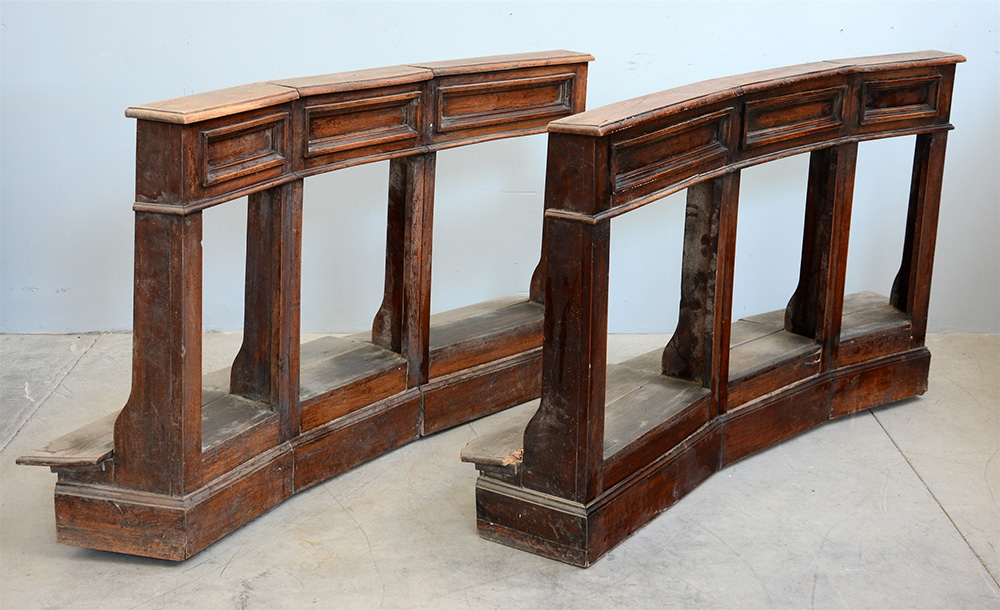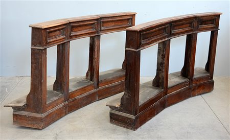 Lotto di due inginocchiatoi curvi con schienale a giorno e pianetti apribili nella base (difetti e mancanze)
