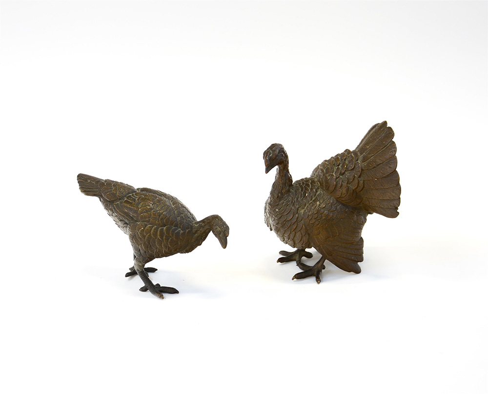 Coppia di sculture in bronzo raffiguranti animali da cortile, misure diverse