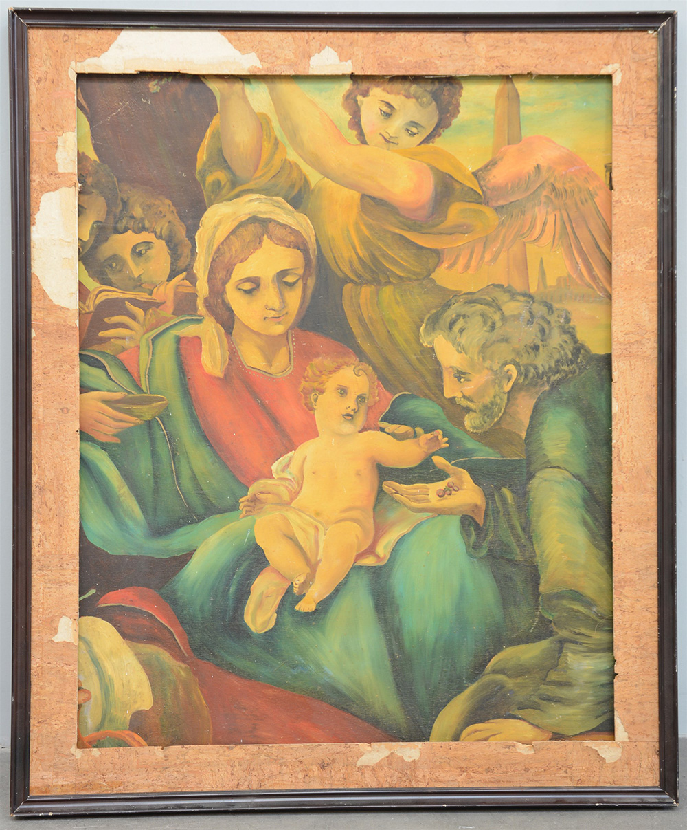 Ignoto "Madonna con bambino e angeli" olio su compensato (cm 113x93) in cornice (difetti e mancanze)