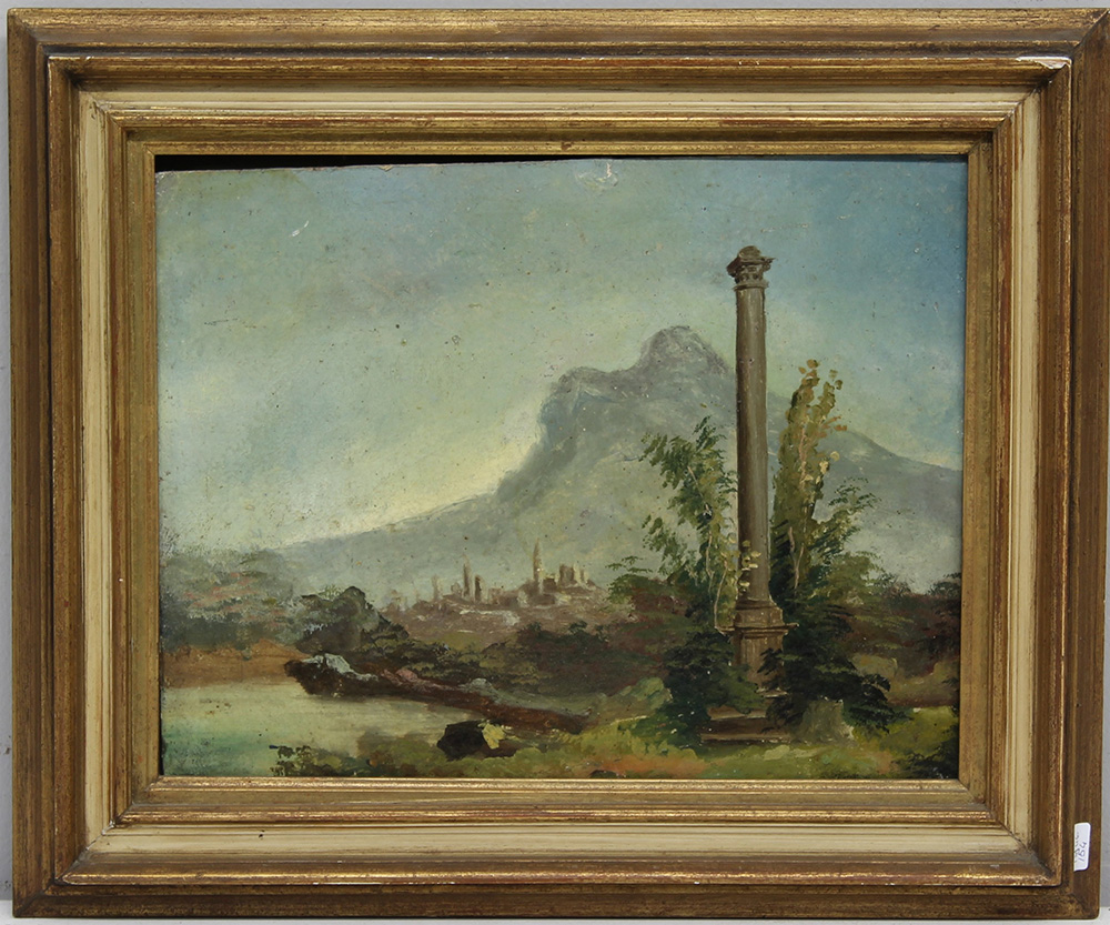 Ignoto "Paesaggio con obelisco e città sullo sfondo" olio su cartoncino (cm 22x25) in cornice (difetti)