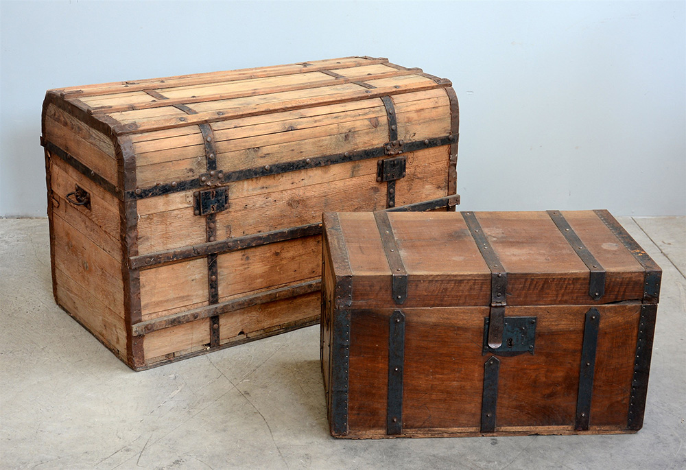 Baule da viaggio in legno con coperchio bombato con maniglie e profili in ferro (difetti)