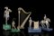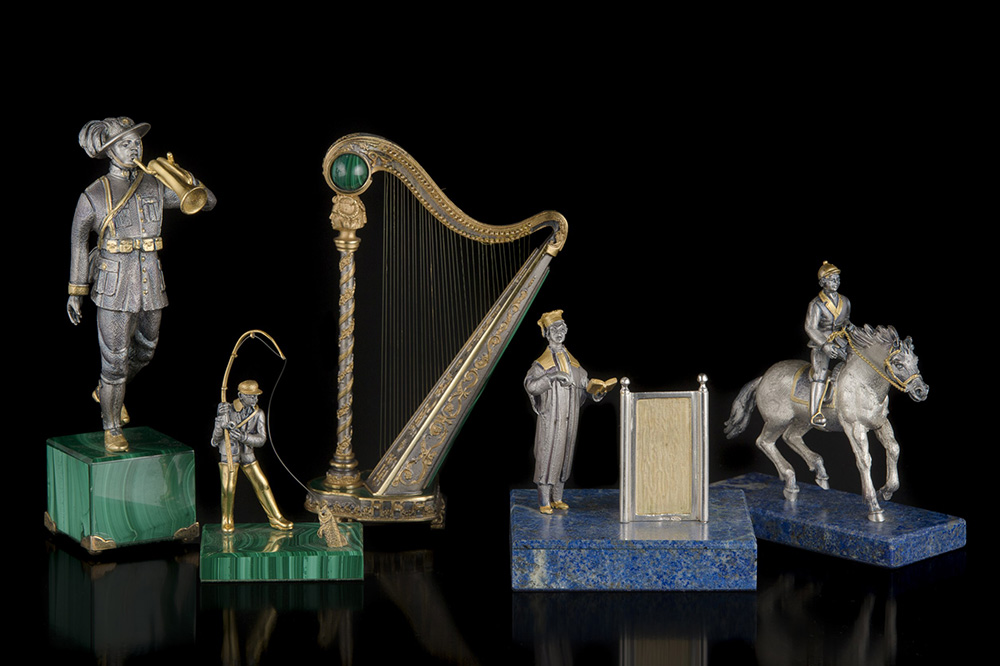 Lotto in argento parzialmente dorato composto da quattro sculture raffiguranti figure delle professioni e dello sport, ed un modellino di arpa; basi e componenti in malachite o lapislazzulo. Milano, secolo XX (h. max cm 14,5 ca.) (lievi difetti)