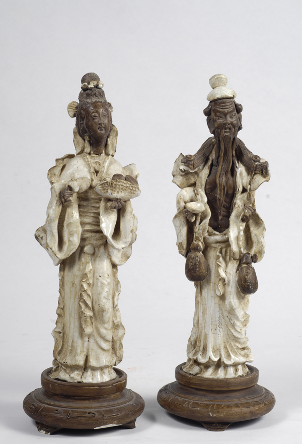 Figura di dama e vecchio contadino Coppia di sculture in terracotta dipinta e invetriata, marcate alla base, Cina, XX sec. € 280/380