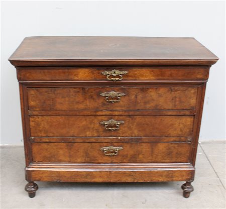 Comò in noce ad un cassetto sottopiano e tre grandi sul fronte. Piedi torniti. Sec. XIX (cm 119x96x57)(difetti)