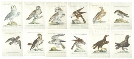 Civette e rapaci dodici stampe colorate a mano, cm. 41,5x33,5 in cornice € 5.000/6.001
