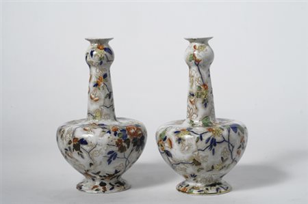 Coppia di vasi in porcellana policroma, con decori floreali, marcata alla...