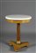 Tavolino circolare listrato in noce, gamba a colonna dipinta poggiante su base tarpeziodale, piedi a cipolla, piano in marmo € 650/8.500