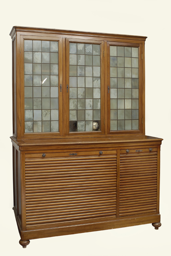Mobile vetrina a doppio corpo in ciliegio, tre sportelli con vetri legati a piombo nella parte superiore e due sportelli a saracinesca nella parte inferiore, cassettiere interne, piedi anteriori a cipolla, inizi del XX sec. cm. 242x176x83 € 1.000/1.500