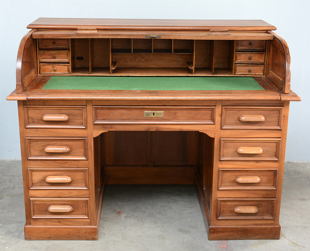 Scrivania da centro con calatoia a rullo in noce, antine laterali apribili e piano scrittoio estraibile rivestito in piano verde. Nove cassetti sul fronte, vani e cassettini interni (cm 140x106x81) (difetti)