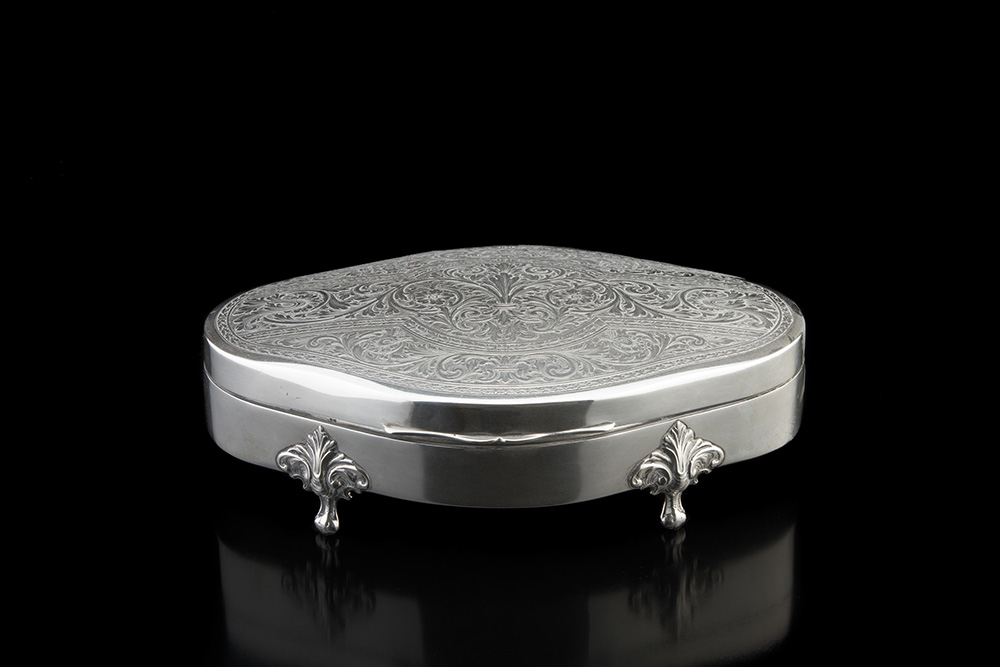 Scatola in argento di forma ovale sagomata con coperchio inciso a girali fogliati, sorretta da quattro piedini. Italia, inizio secolo XX (lungh. cm 21,5x15xh. cm 6,5) (g 450 ca.) (lievi difetti)