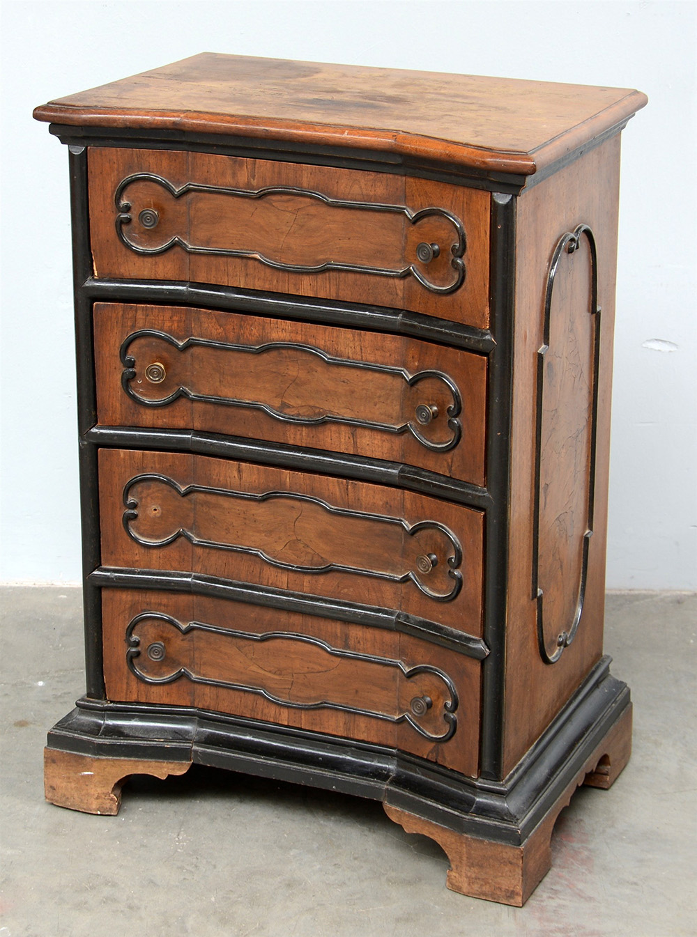 Comodino lombardo in noce con fronte sagomato a quattro cassetti decorati con sagomette ebanizzate (cm 51x75x34) (difetti)