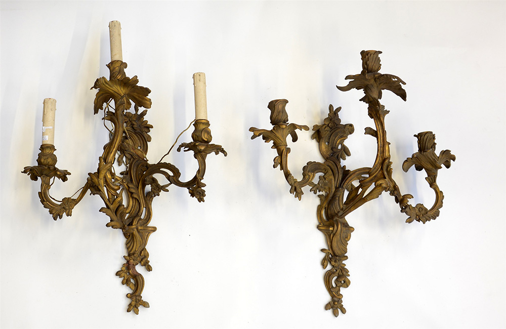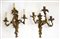 Coppia di appliques in bronzo dorato a tre luci, a forma di rami fogliati con fiori (difetti)