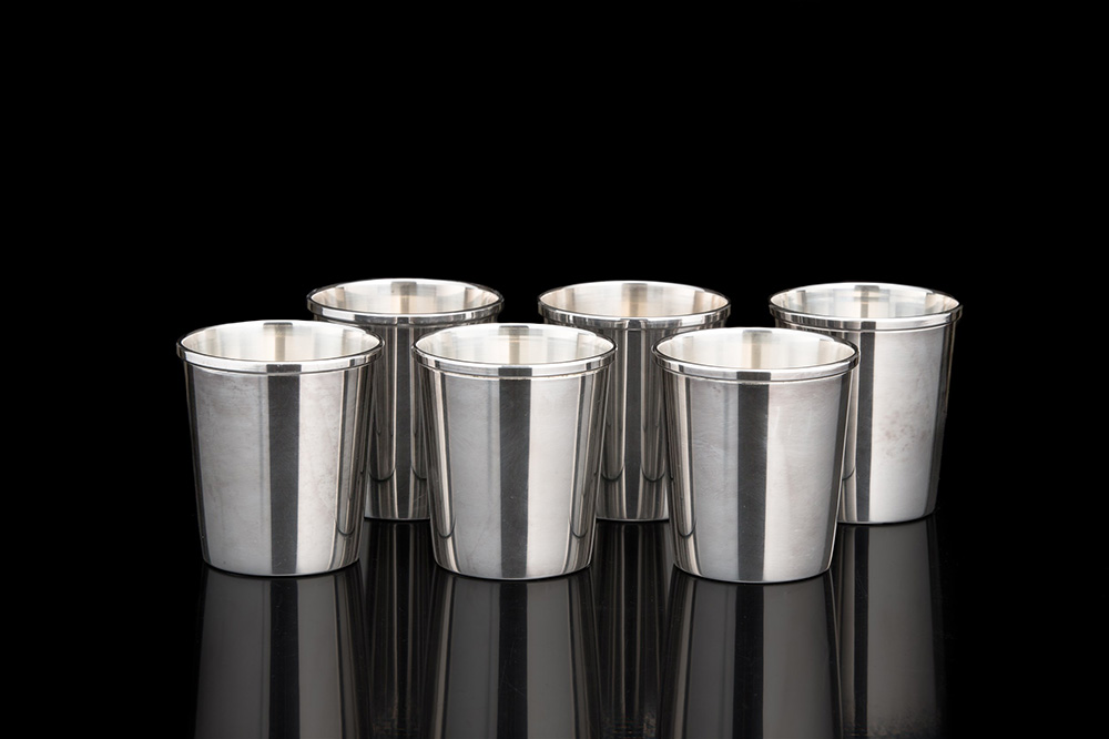 Sei bicchieri in argento leggermente troncoconici con superficie liscia. Padova, manifattura moderna, argentiere Zaramella, marcato Nicoletti (h. cm 8,5 ca.; d. cm 7,8 ca.) (g tot 710 ca.) (lievi difetti)