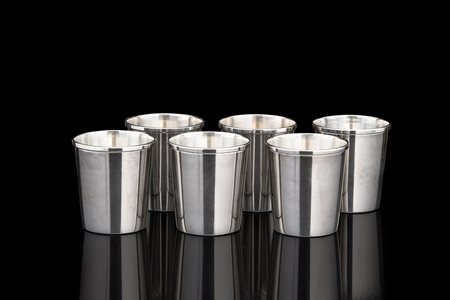 Sei bicchieri in argento leggermente troncoconici con superficie liscia....