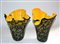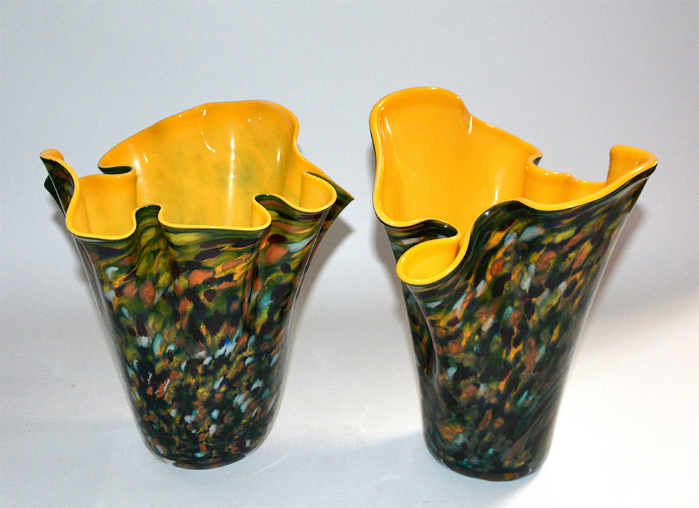 Lotto composto da due vasi a fazzoletto in vetro policromo, interno in vetro giallo (h max cm 33)