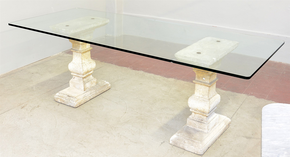Tavolo rettangolare con piano in cristallo e gambe a colonna in pietra (cm 244x78x100)(difetti)