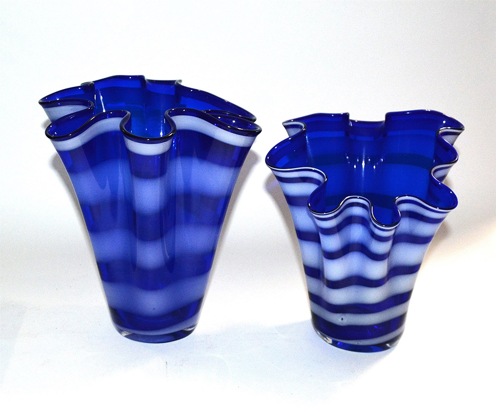 Lotto composto da due vasi a fazzoletto in vetro blu decorato a striature (h...