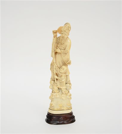 Okimono in avorio raffigurante un saggio con ventaglio e fanciullo con base...