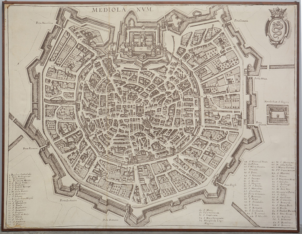 Stampa su tessuto raffigurante un’antica mappa di Milano (cm 152x198), in cornice (difetti)
