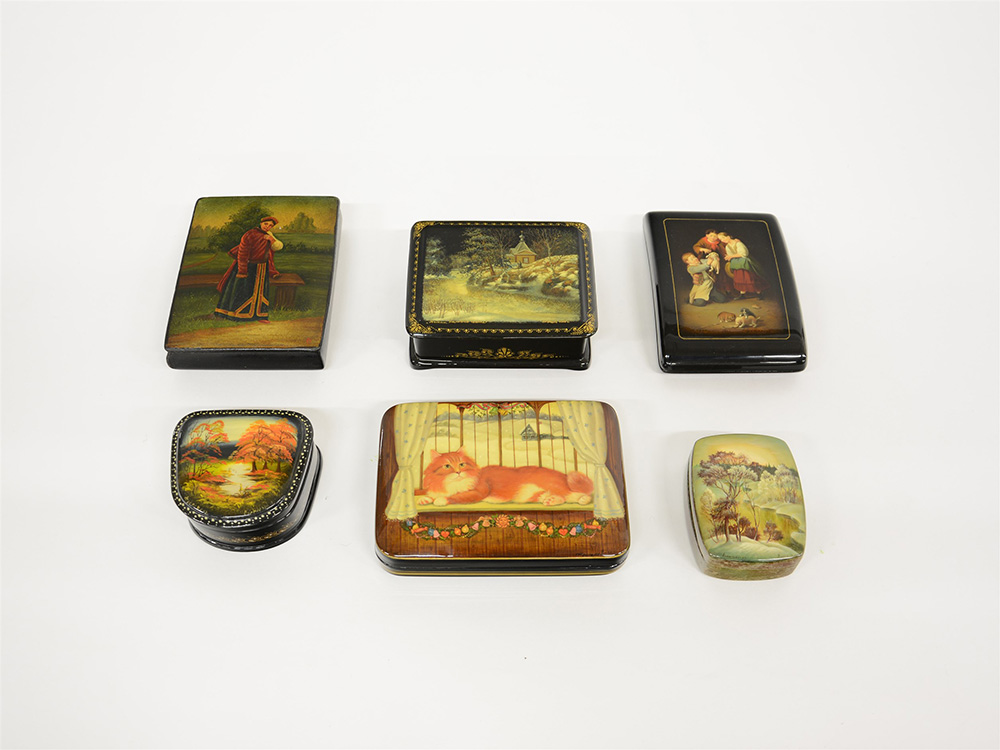 Lotto composto da sei scatoline russe in legno laccato con coperchi dipinti a paesaggi e figure, secolo XX (difetti)