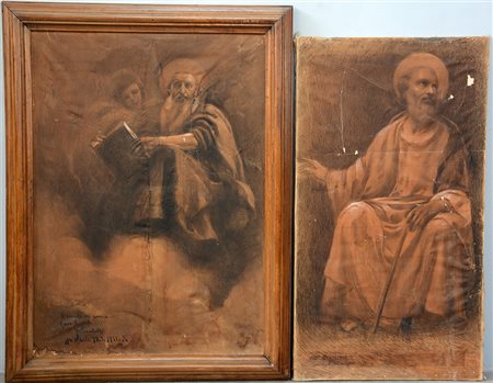 Lotto di due cartoni preparatori raffiguranti santi per gli affreschi della chiesa parrocchiale di Mede. Matita e biacca su carta incollata su tela (cm 128x92 e 135x75). Dedica di omaggio, firma e data 1932 in basso a sinistra, uno in cornice (difetti e restauri)