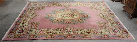 Disegno floreale policromo con medaglione su fondo rosa. Cimatura scolpita (cm 244x184) (difetti)