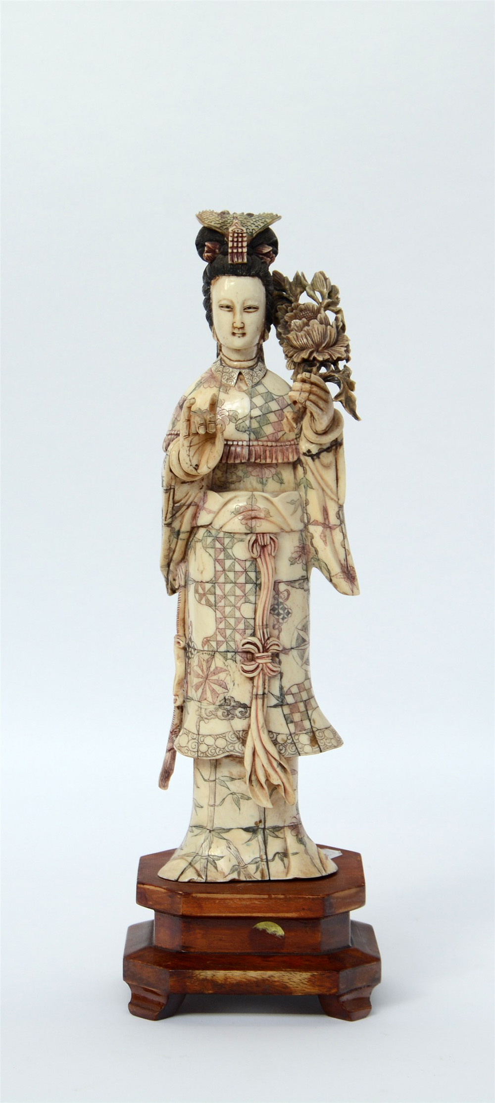 Figura femminile in osso decorato a tasselli colorati (h. 34 cm.) base in legno(difetti) Cina, sec. XX
