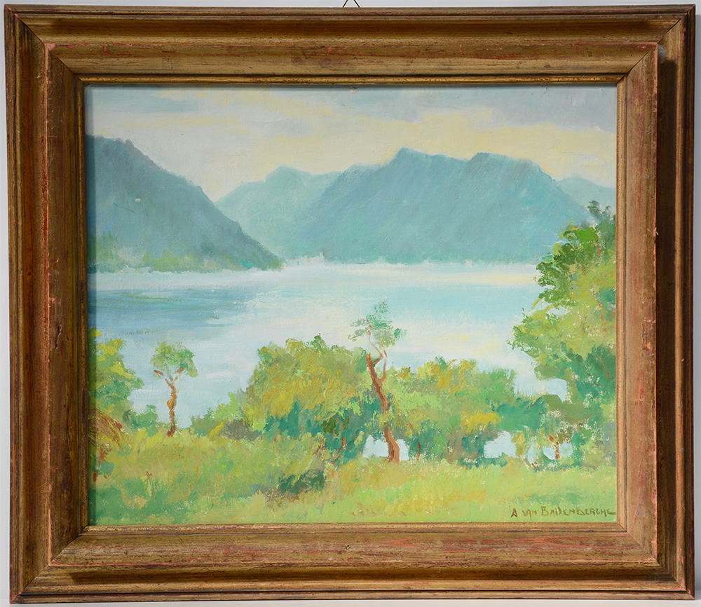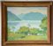 Firma indecifrata "Paesaggio lacustre" olio su cartone (cm 50x60) firmato in basso a destra, in cornice