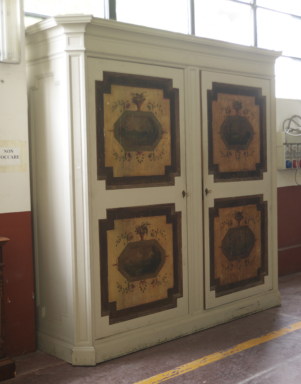 Armadio a quattro pannelli dipinti con paesagggi e motivi neoclassici (cm 243x231x69) (difetti)