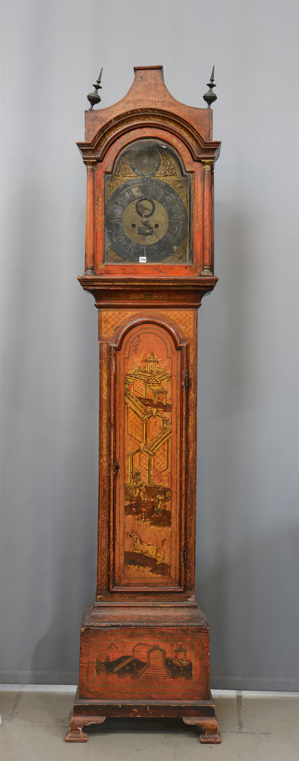 Pendola a torre in legno laccato rosso e dorato, decorata a cineserie, movimento con carica settimanale con suoneria delle ore su campanello, quadrante a fascia con numeri arabi e romani, data e calendario (h cm 210) (difetti e mancanze)