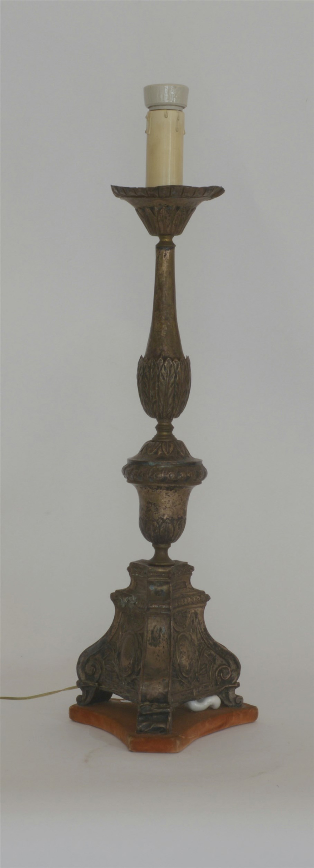 Candeliere in metallo argentato e sbalzato a motivi vegetali. Sec. XVIII (h. cm 52)